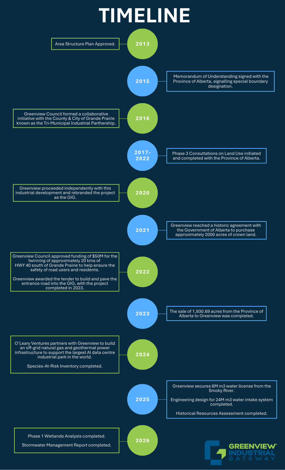 Greenview’s journey began in 2013 with the approval of the Area Structure Plan (ASP) on 18,660 acres of crown land, signalling the district’s intent to develop a world-class industrial hub. By 2015, Greenview had secured a Memorandum of Understanding with the Province of Alberta, paving the way for a special boundary designation. These early steps were critical in setting the foundation for what would become a transformative project for the region.
